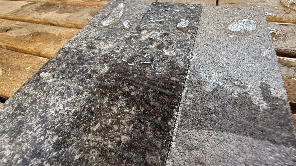 En intérieur les pierres naturelles sur les zones à risques (WC, toilettes, salle de bain, cuisine...) doivent être protégées avec un produit hydrofuge, oléofuge transparent, efficace et non filmogène pour éviter un effet plastique qui dénaturerait la surface de la pierre.