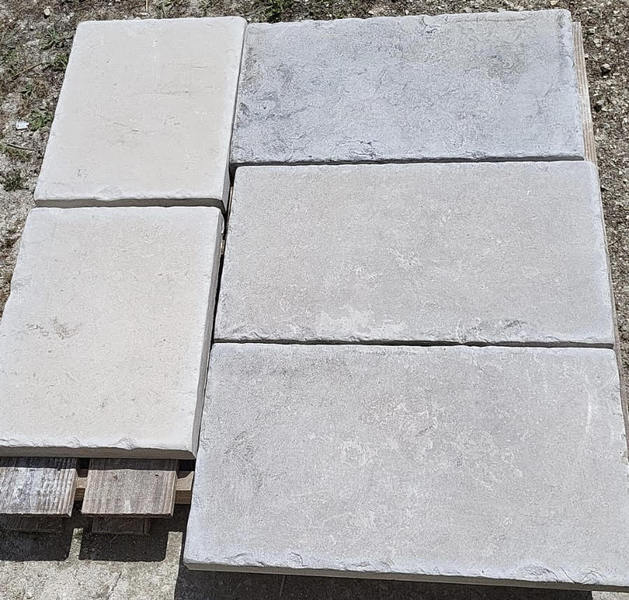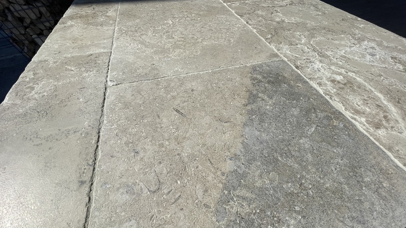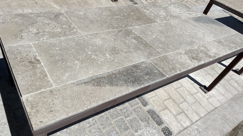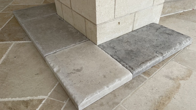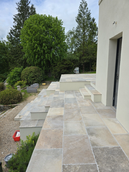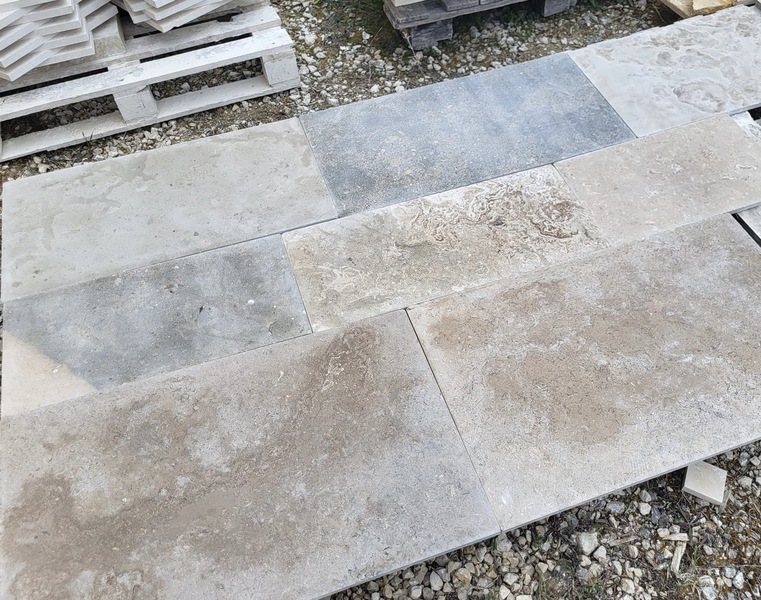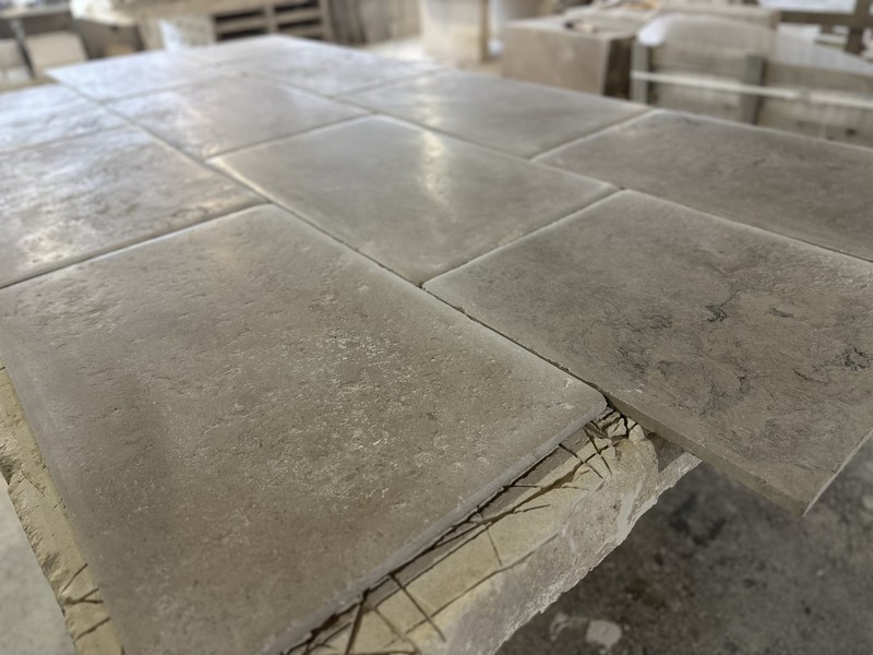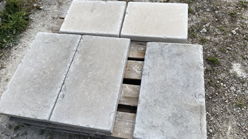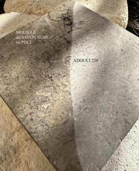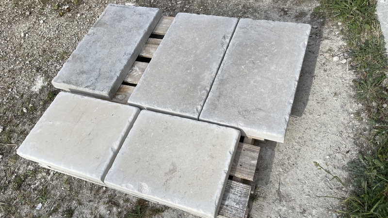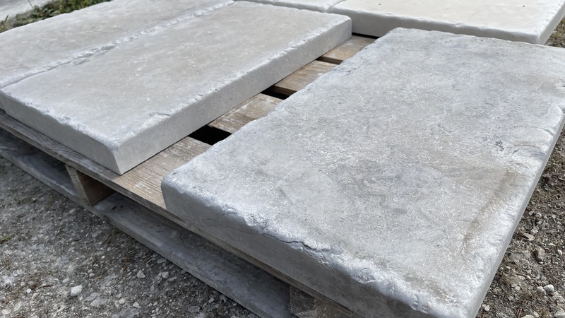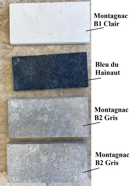 Chez Francepierre, la pierre de dordogne (Périgord B2 gris) se décline en ouvrages sur mesure : dallages intérieur/extérieur, margelles, pavés, parements, escaliers, plans de travail, éviers massifs, vasques, cheminées, tables, pieds de table, tombales, bar de Montpellier.