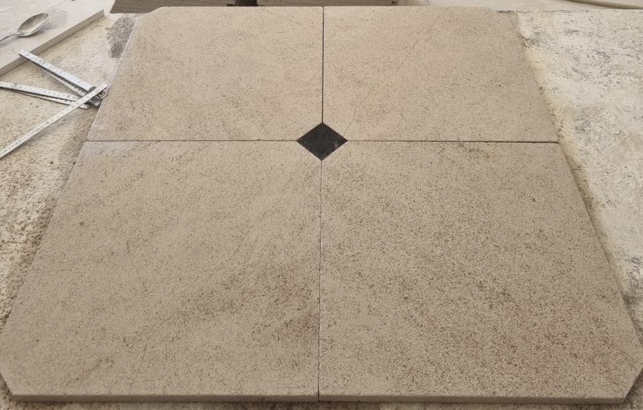 Pierre de Semond brossé 40x40 cm en pierre de Bourgogne Franche Comté + cabochon en bleu du  Hainaut 6x6 cm Pierre de Semond brossé 40x40 cm en pierre de Bourgogne Franche Comté + cabochon en bleu du Hainaut 6x6 cm