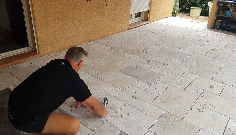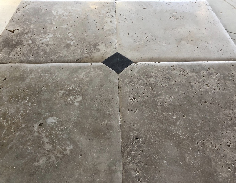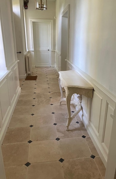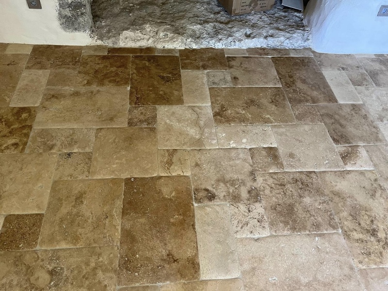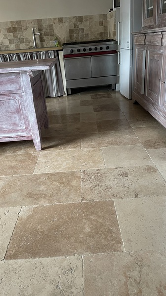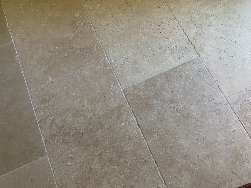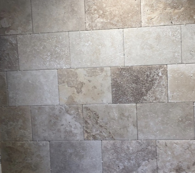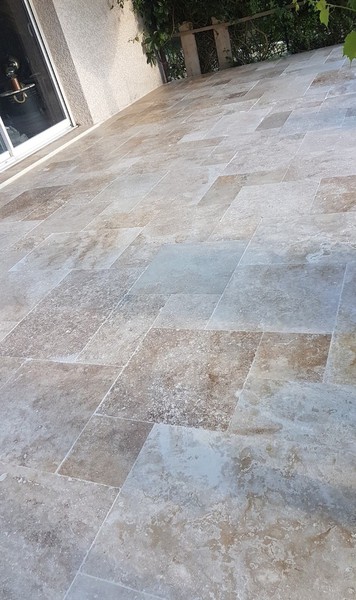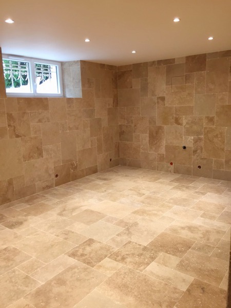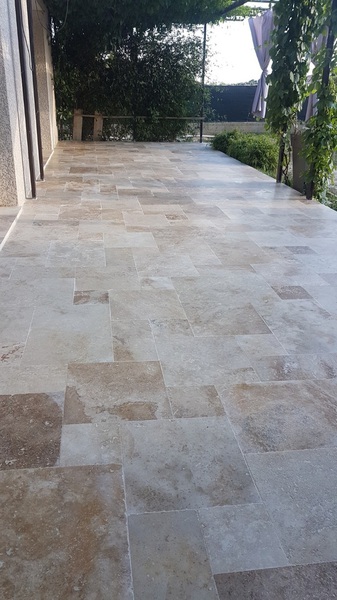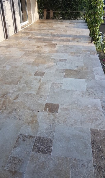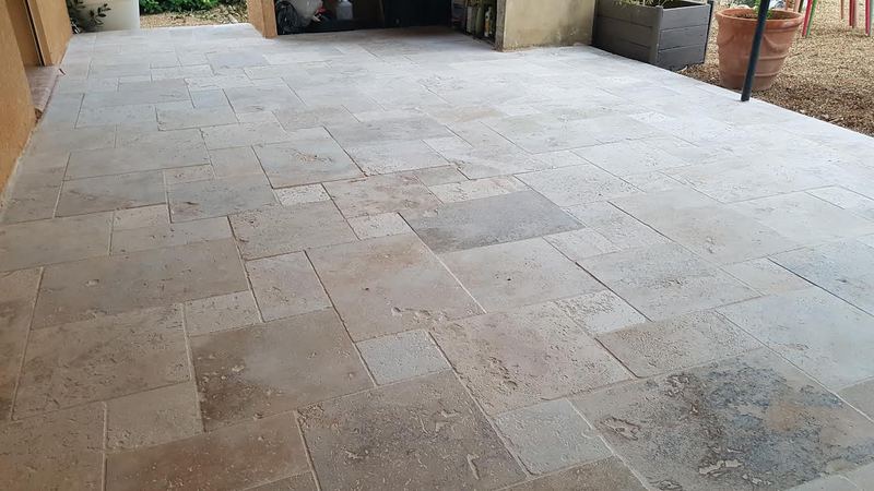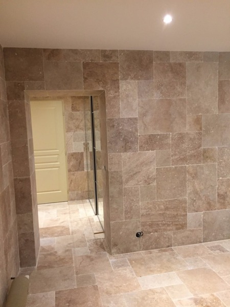 Le travertin en épaisseur 1,2 cm est très pratique et simple à coller pour recouvrir un vieux sol sans rien casser. La couleur des joints peut varier selon vos goûts : généralement le ton pierre convient et passe partout.