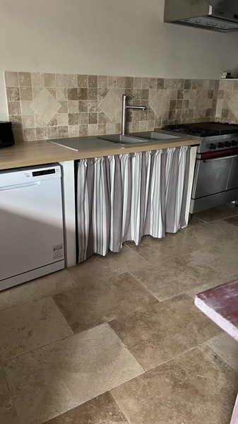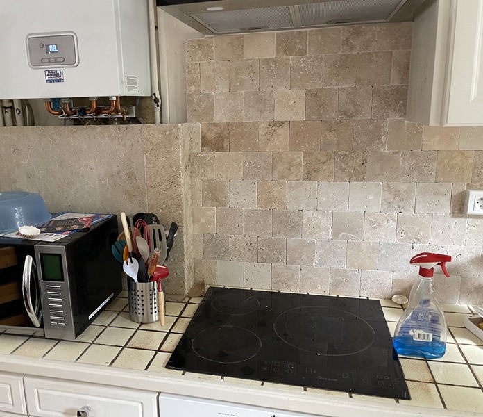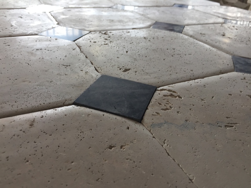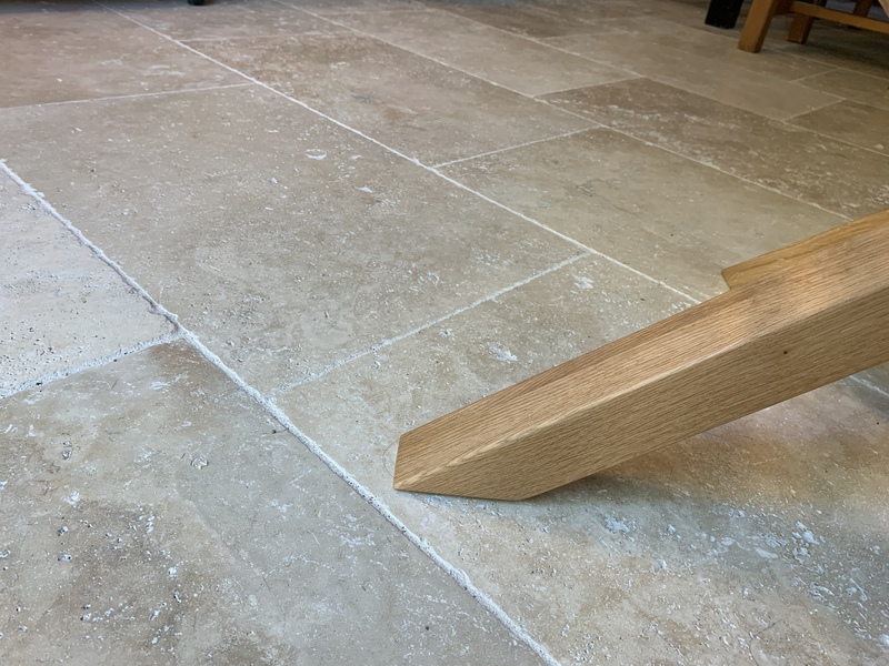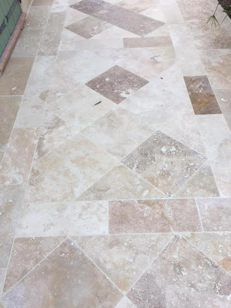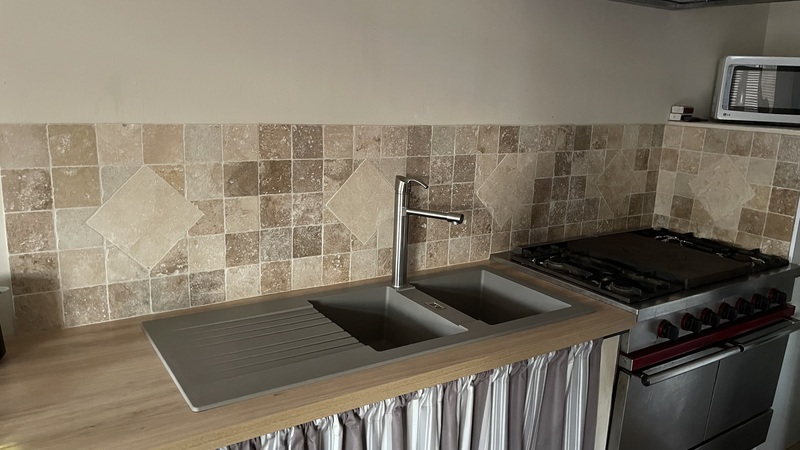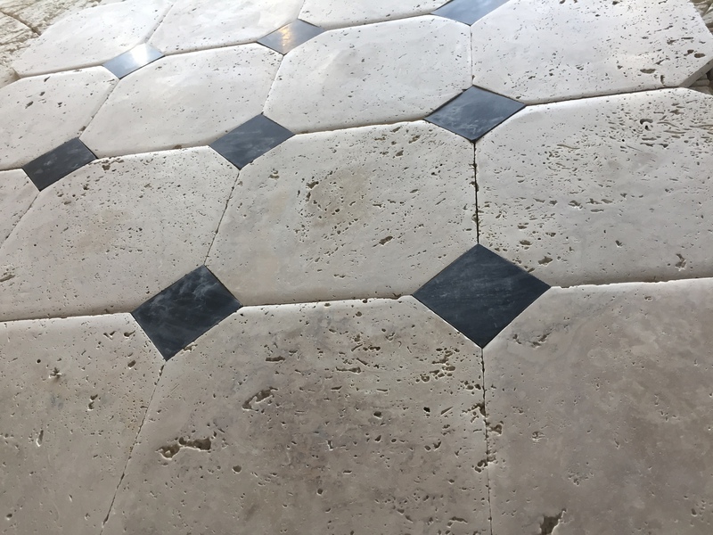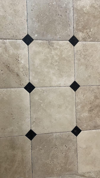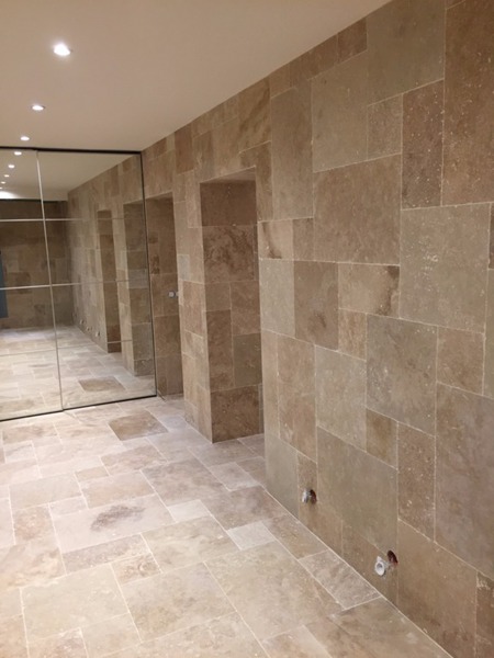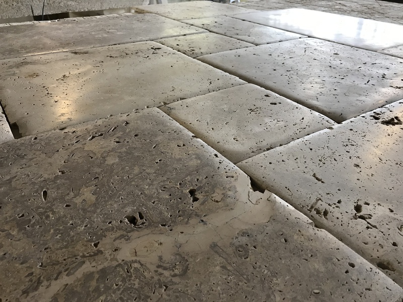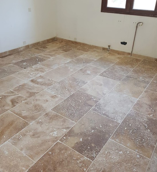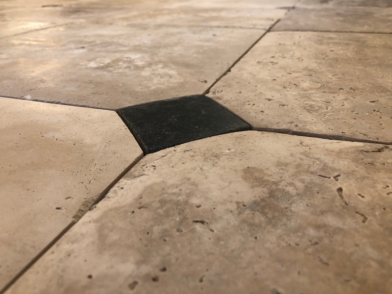 Le travertin en épaisseur 1,2 cm est très pratique et simple à coller pour recouvrir un vieux sol sans rien casser. La couleur des joints peut varier selon vos goûts : généralement le ton pierre convient et passe partout.