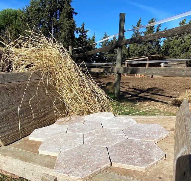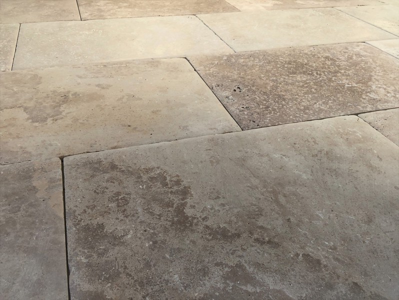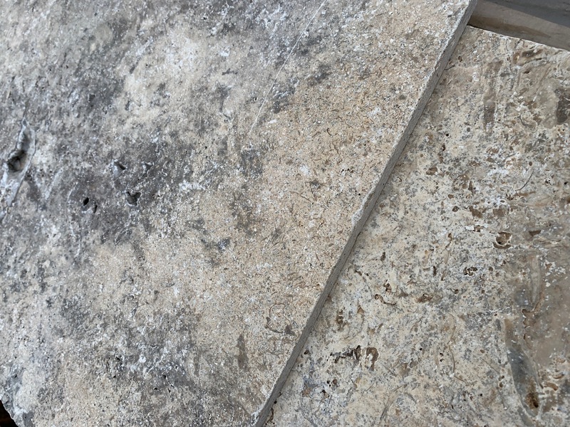Ce travertin excelle sur les grandes surfaces extérieures : allées carrossables, aménagements paysagers, cours ou entrées de ferme. Ses gros trous peuvent être comblés lors de la pose pour jouer sur les effets de texture et de contraste, ou laissés bruts pour renforcer l’esprit nature.